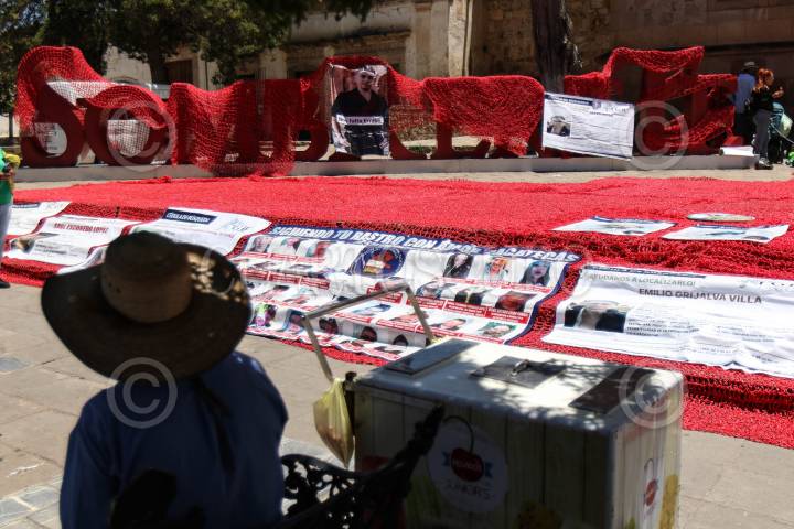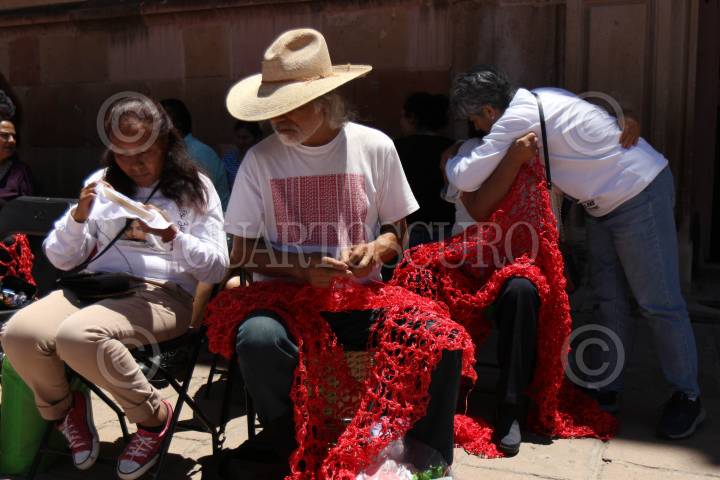SOMBRERETE, ZACATECAS, 18AGOSTO2024.- Familiares de desaparecidos en el municipio y el estado, en compañía de personas solidarias pertenecientes a la colectiva Sangre de mi Sangre, realizaron una actividad de tejido y sensibilización con la población en la explana de la Parroquia de San Juan Bautista; sobre el problema de la desaparición de personas en la entidad, la cual ha llegado a la cifra de 4 mil desapariciones. FOTO: ADOLFO VLADIMIR /CUARTOSCURO.COM