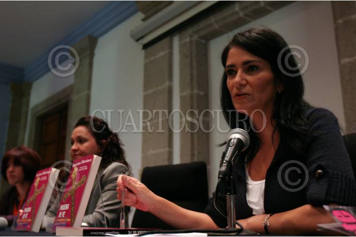 MEXICO, D.F., 23FEBRERO2008.- La escritora Sanjuana Martínez, durante la presentación de su libro Prueba de la Fe, que aborda los casos de pederastía dentro de la iglesia católica, la acompaño la Lydia Cacho. La conferencia se realizó en el marco de las actividades de la Feria Internacional del Libro en el Palacio de Minería. FOTO: MOISÉS PABLO/CUARTOSCURO.COM