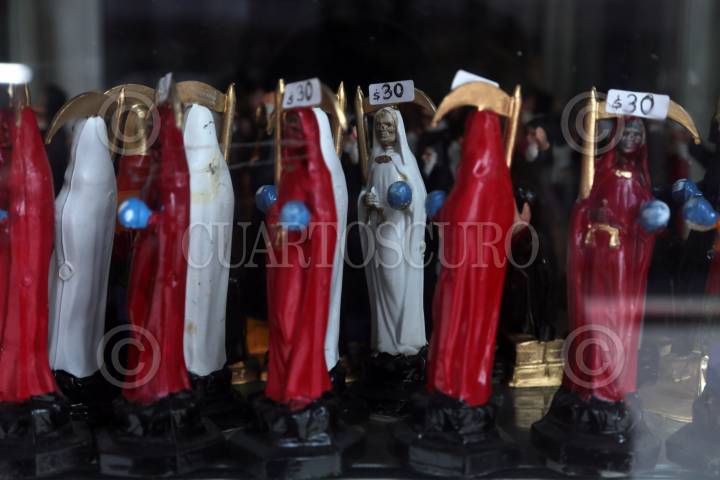 CUERNAVACA, MORELOS, 21AGOSTO2018.- Figuras de la santa muerte son exhibidas en una vitrina de una tienda de productos religiosos en el centro de la ciudad. FOTO: MARGARITO PÉREZ RETANA /CUARTOSCURO.COM