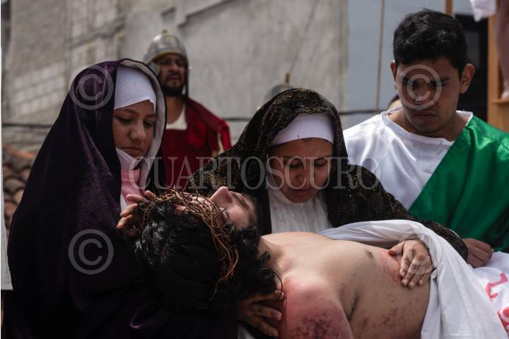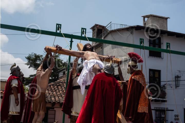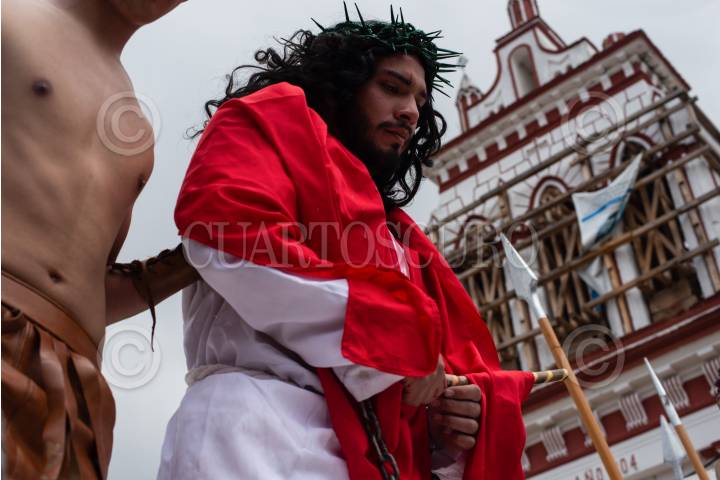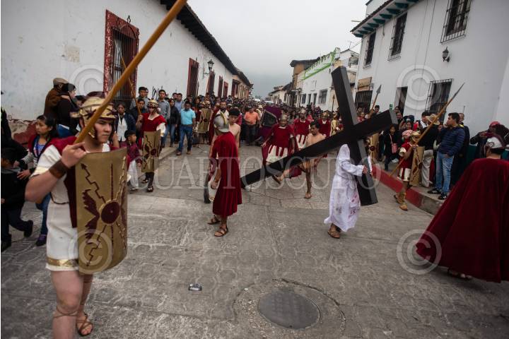 SAN CRISTOBAL DE LAS CASAS, CHIAPAS, 19ABRIL2019.- Decenas de jóvenes realizaron la representación del Viacrucis, con un recorrido por las calles del centro de la ciudad, para después llevar a cabo la crucifixión de Jesús en la explanada del Barrio de Mexicanos. Durante toda la caminata todas las banquetas se encontraban llenas de espectadores. FOTO: ISABEL MATEOS /CUARTOSCURO.COM
