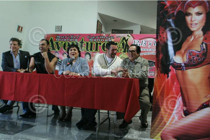 MÉXICO, D.F, 08FEBRERO2010.- El conductor de televisión, Mario Carballido junto Latin Lover, Carmen Salibas, Eduardo Santamarina y el primer actor, Ernesto Gomez Cruz, durante la conferencia de prensa que se realizó para anunciar las próximas presentaciones de la puesta en escena "Aventurera" que se realizó en el Teatro Blanquita". FOTO: ENRIQUE ORDÓÑEZ/CUARTOSCURO.COM