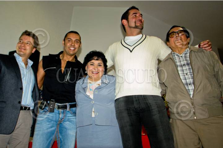 MÉXICO, D.F, 08FEBRERO2010.- El conductor de television, Mario Carballido junto a Carmen Salinas, Eduardo Santamarina y Latin Lover, posaron para los fotógrafos durante la conferencia de la puesta en escena "Aventurera" que se realizó en el Teatro Blanquita". FOTO: ENRIQUE ORDÓÑEZ/CUARTOSCURO.COM