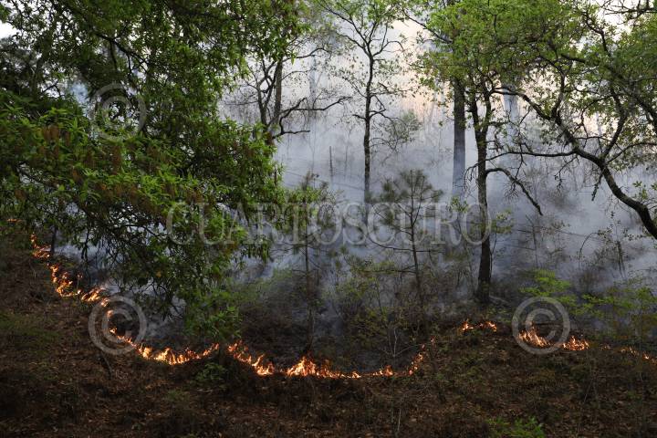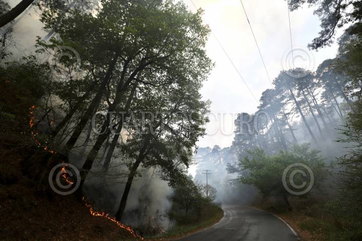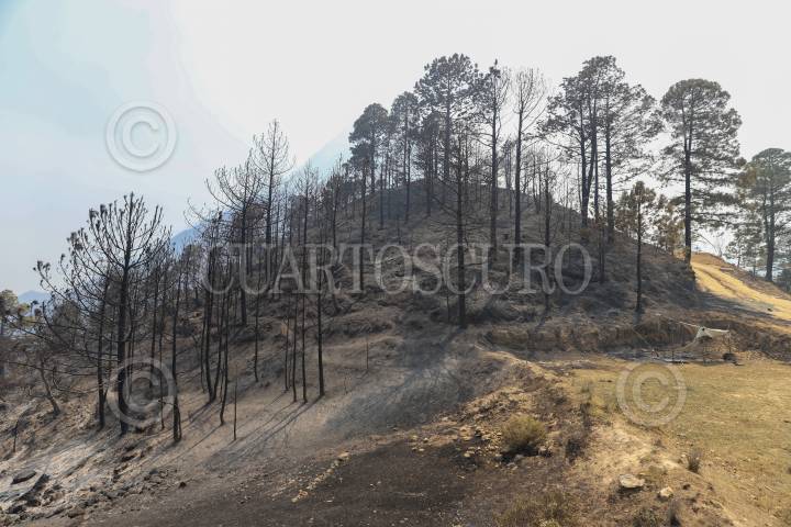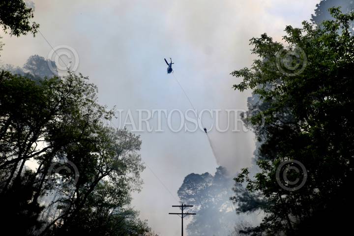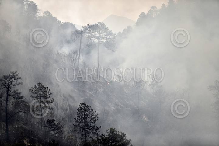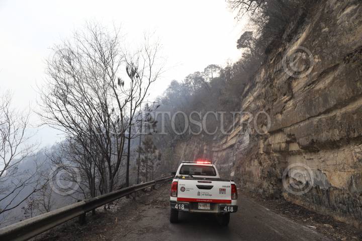 Continúan labores para combatir incendio en Sierra de Santiago en la zona conocida como ejido La Ciénaga. Fuertes vientos e intenso calor provocan la intensificación del siniestro y largas cortinas de humo.