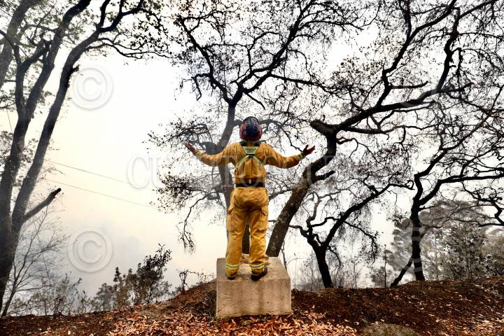 Un brigadista de Conafor levanta sus manos y voltea al cielo dándole Gracias a Dios, por las lluvias que se están registrando en estos momentos en la sierra de Santiago Nuevo León. Por más de 20 días, los brigadistas trabajan a marcha forzada para combatir el incendio forestal.