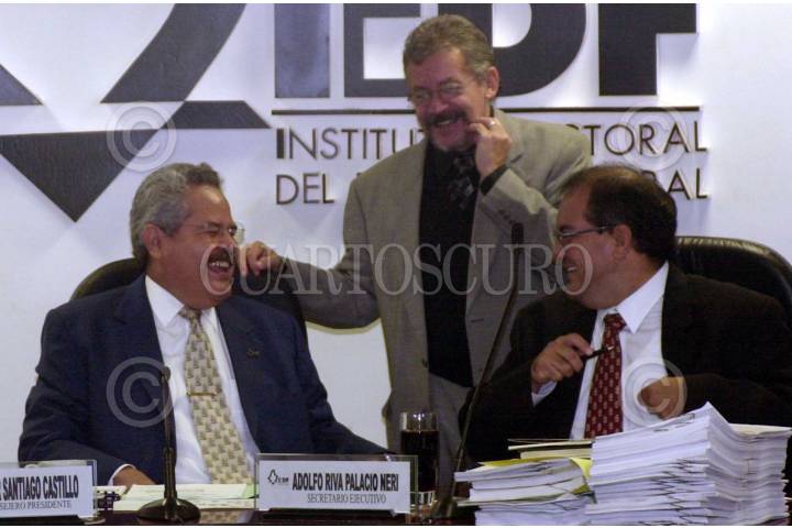 El consejero presidente del IEDF, Javier Santiago Castillo y el secretario ejecutivo, Adolfo Rivapalacio, previo al inico de la sesión ordinaria. En la sesión se trató la determinación e imposición de sanciones en contra del Partido del Trabajo por exceder el límite establecido para gastos de campaña. FOTO: Iván Stephens/CUARTOSCURO.COM