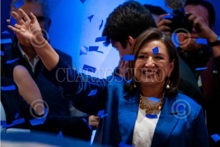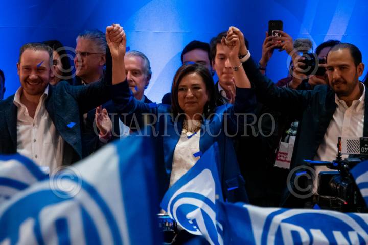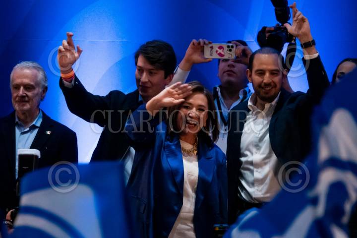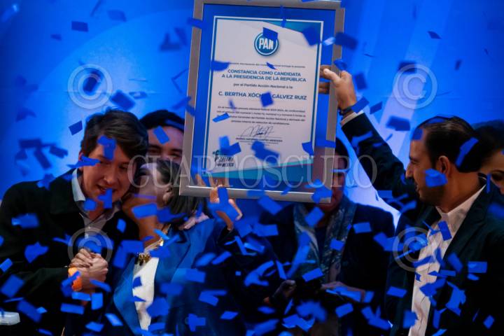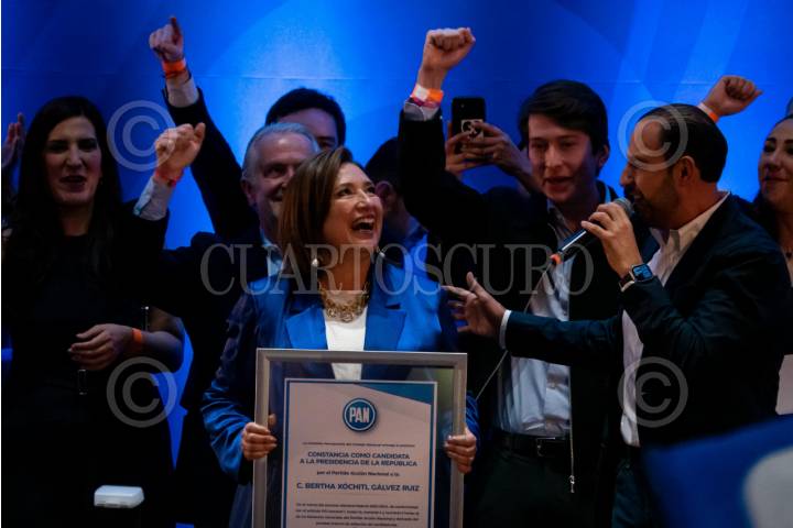 CIUDAD DE MÉXICO, 27ENERO2024.- Xóchitl Gálvez, candidata a la presidencia de la República por la alianza PRI-PAN-PRD, recibió su constancia como candidata del partido. Afirmo que el país se encuentra en un proceso de perder la libertad y una disolución de poderes. Marko Cortés, presidente nacional del Partido Acción Nacional, fue quien le entregó su constancia a la ahora candidata. FOTO: GALO CAÑAS/CUARTOSCURO.COM