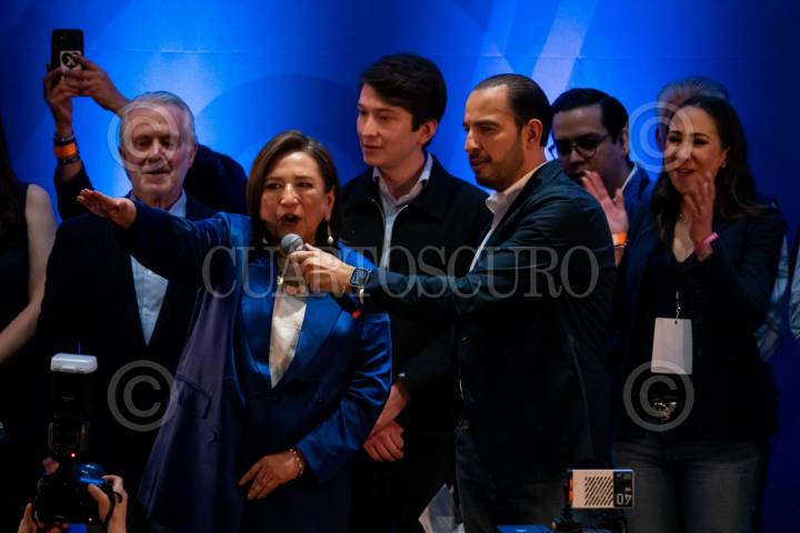 CIUDAD DE MÉXICO, 07ABRIL2024.- Xóchitl Gálvez, candidata a la presidencia de la República Mexicana por el PAN, acompañada de Santiago Creel, coordinador de campaña; Marko Cortés, presidente del PAN, y la senadora Kenya López Rabadán durante su llegada en la primer debate en las instalaciones del Instituto Nacional Electoral. FOTO: GRACIELA LÓPEZ /CUARTOSCURO.COM
