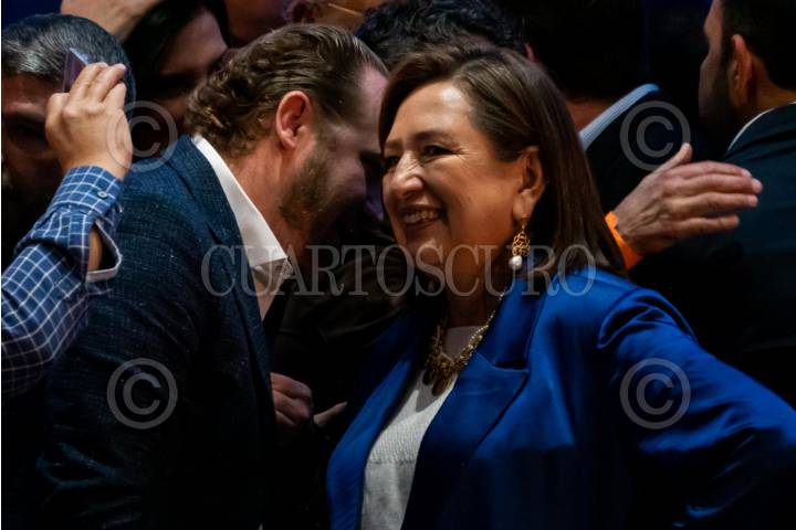 CIUDAD DE MÉXICO, 27ENERO2024.- Santiago Taboada, candidato a la jefatura de Gobierno de la Ciudad de México, y Xóchitl Gálvez, candidata a la presidencia de la República por la alianza PRI-PAN-PRD, durante la entrega de constancia como candidata del partido. FOTO: GALO CAÑAS/CUARTOSCURO.COM