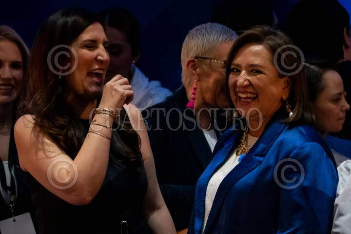 CIUDAD DE MÉXICO, 27ENERO2024.- Kenia López Rabadán, jefa de oficina de Xóchitl Gálvez, y Xóchitl Gálvez, candidata a la presidencia de la República por la alianza PRI-PAN-PRD, durante la entrega de su constancia como candidata del partido. FOTO: GALO CAÑAS/CUARTOSCURO.COM