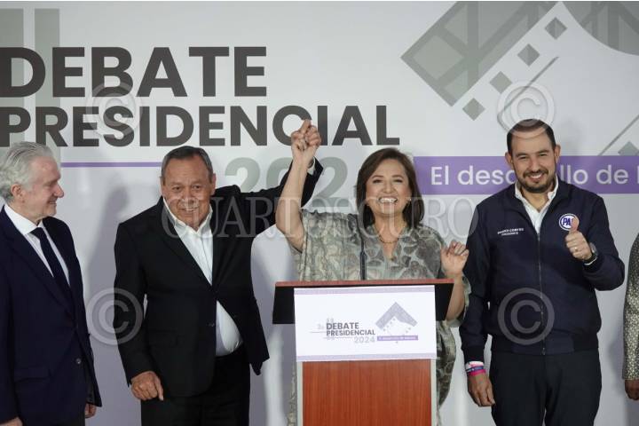 CIUDAD DE MÉXICO, 07ABRIL2024.- Ricardo Monreal, Kenya López Rabadán, Santiago Creel y Margarita Zavala, durante el primer debate presidencial en las instalaciones del Instituto Nacional Electoral. FOTO: GRACIELA LÓPEZ /CUARTOSCURO.COM