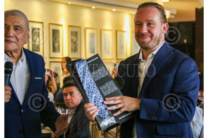 CIUDAD DE MÉXICO. 13MAYO2024.- Santiago Taboada Cortina, candidato de la Alianza Va Po la CDMX, se reunió está tarde con miembros de la Sociedad de Autores y compositores, en sus instalaciones de la Colonia Xoco de la alcaldía Benito Juárez. Le obsequiaron una corbata de Armando Manzanero. FOTO: VICTORIA VALTIERRA/CUARTOSCURO.COM