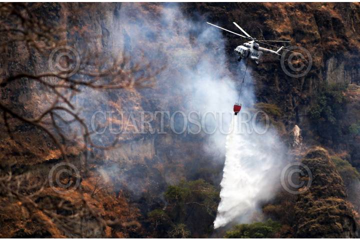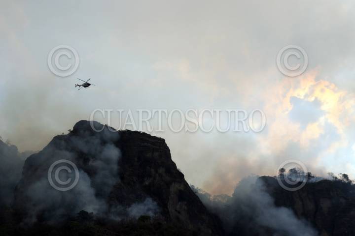 Helicópteros de la Comisión Nacional del Agua y de la Secretaria de la Defensa Nacional combaten incendio forestal de Tepoztlán.