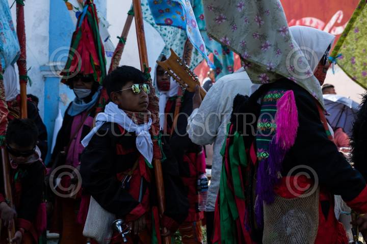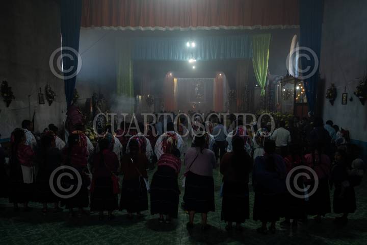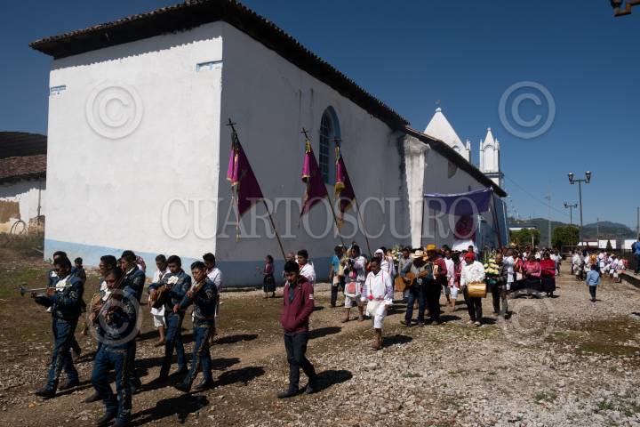 Autoridades de la comunidad y pobladores de Aldama acompañan a Santa Magdalena durante su recorrido por la cabecera municipal durante la celebración del Cuarto Viernes de Cuaresma.