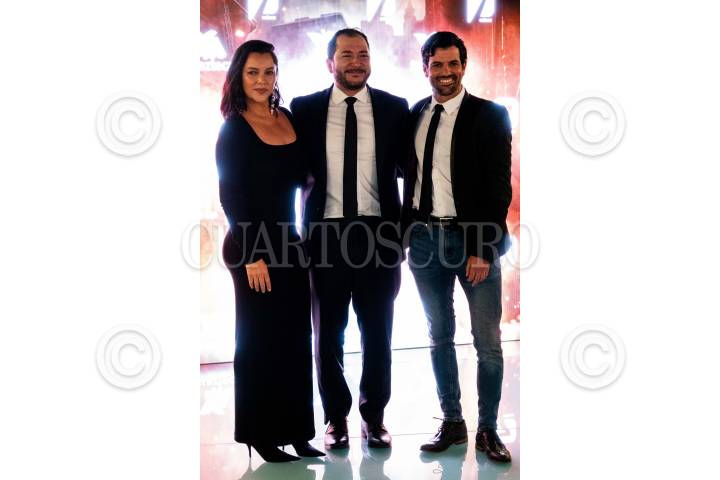 CIUDAD DE MÉXICO, 24OCTUBRE2023.- La actriz Sara Maldonado, Adrián Ortega, director de Contenidos de TV Azteca, y el actor Claudio Lafarga durante la presentación del elenco de la serie televisiva Lotería del Crimen y del primer capítulo de la segunda temporada, la cual protagonizan. FORO: GALO CAÑAS/CUARTOSCURO.COM