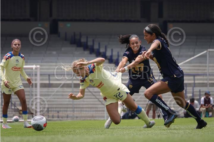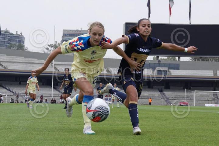 Sarah Luebbert, defensa del Club América, y Bibiana Quintos, defensa de Pumas, disputaron el balón durante la Jornada 1 Apertura 2023, en el Estadio Olímpico Universitario