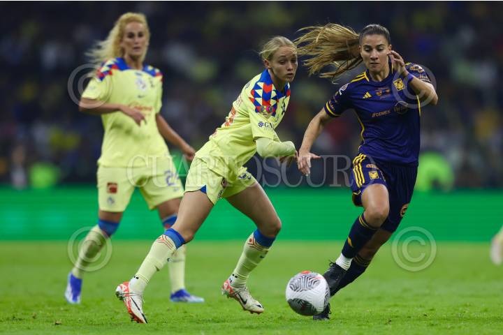 CIUDAD DE MÉXICO, 24NOVIEMBRE2023. Sarah Luebbert del América y Lydia Rangel de Tigres disputan un balón durante el partido de fútbol América vs Tigres correspondiente a la final de ida del Torneo Apertura 2023 de Liga BBVA MX Femenil, en el Estadio Azteca. FOTO: EDGAR NEGRETE/CUARTOSCURO.COM
