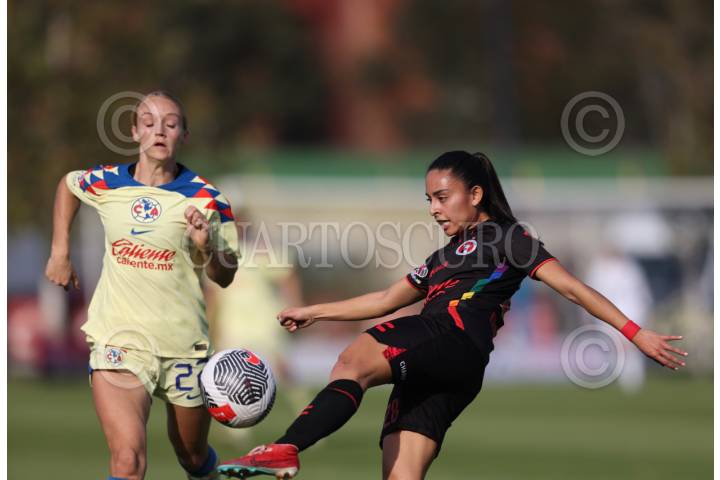 CIUDAD DE MÉXICO, 18ENERO2024. Sarah Luebbert de América y Bibiana Quintos de Tijuana durante el partido de fútbol América vs Tijuana correspondiente a la jornada 3 del Torneo Clausura 2024 de Liga BBVA MX Femenil, en instalaciones de Coapa. FOTO: EDGAR NEGRETE LIRA/CUARTOSCURO.COM