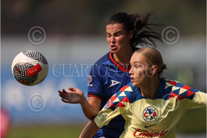 CIUDAD DE MÉXICO, 29MARZO2024. Rocío Martínez de Cruz Azul y Sarah Luebbert de la Águilas disputan una pelota durante el partido de fútbol Cruz Azul vs América correspondiente a la jornada 13 del Torneo Clausura 2024 de Liga BBVA MX Femenil, en instalaciones de La Noria. FOTO: EDGAR NEGRETE/CUARTOSCURO.COM