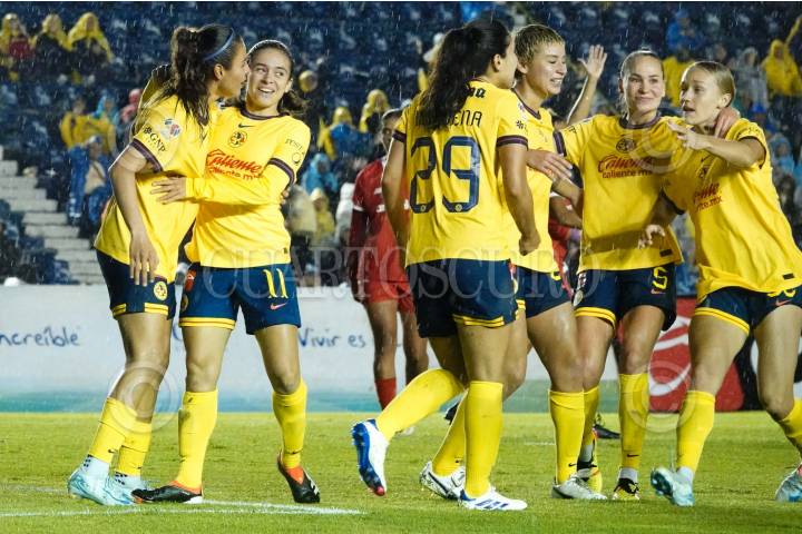 Katty Martínez, Jocelyn Orejel, Casandra Cuevas, Sarah Luebbert y Sabrina Enciso, jugadoras del Club América, celebraron un gol anotado a su favor contra Pumas durante la Jornada 1 en el Estadio Olímpico Universitario