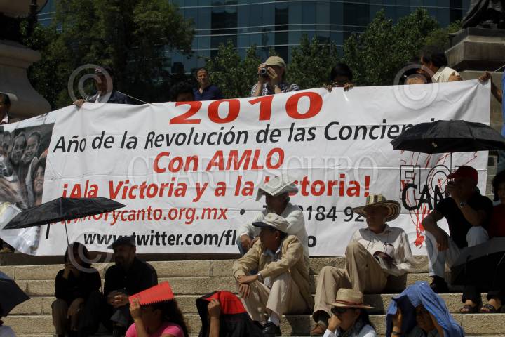 MÉXICO, D.F., 04JULIO2010.- La organización Flor y Canto de la Resitencia Civil de apoyo a Andres Manuel López Obrador organizo un homenaje póstumo a los escritores José Saramago y Carlos Monsiváis en la glorieta del Ángel de la Independencia en donde tuvo como orador principal el periodista Genaro Villamil. FOTO: RODOLFO ANGULO/CUARTOSCURO.COM