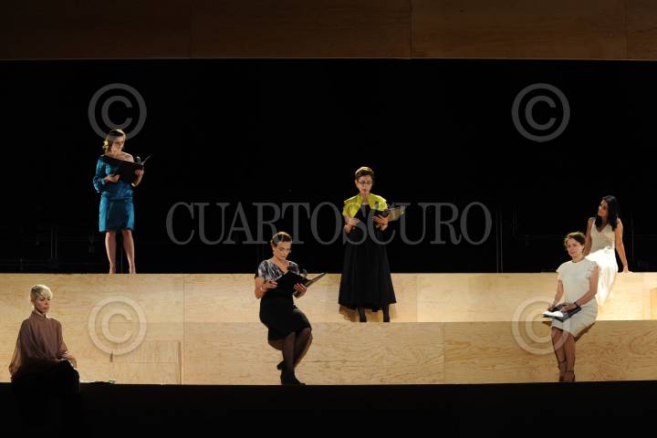 MÉXICO, D.F., 01ABRIL2010.- Irene Azuela, Ely Guerra, Lourdes Ambriz, Pilar del Río, viuda del escritor portugués José Saramago, Clarissa Malheiros y la periodísta Lydia Cacho, durante el ensayo de la puesta "Voces de mujer en la obra de Saramago" realizado en el Palacio de Bellas Artes, donde realizan una lectura escenificada de fragmentos de las obras: Ensayo sobre la ceguera, Memorial del convento, Las intermitencias de la muerte, y un texto inédito sobre María Magdalena. FOTO: ISAAC ESQUIVEL/CUARTOSCURO.COM