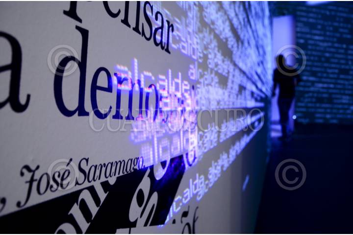 MÉXICO, D.F., 17SEPTIEMBRE2011.- Instalación "Todos los nombres", videoproyecto generada por ordenador de Charles Sandison, 2007. La intensión de Sandison fue la de reunir en una habitación, a todos los personajes que se aparecen en las novelas de Saramago. "En algún momento, las palabras formarían una figura humana, trasunto del autor. De este modo, el artísta quiere transmitir la idea de que los personajes forman al escritor. Integrada por más de 500 documentos originales, además de otros tantos digitalizados, presentados bajo un diseño museográfico innovador que combina los recursos convencionales con los soportes digitales y audiovisuales. Se exhibe en el Antiguo Colegio de San Ildefonso una exposición dedicada a la figura del Premio Nobel de Literatura 1998, José Saramago. El público mexicano podrá acercarse a la vida y obra del escritor portugués, a través de la investigación y curaduría de Fernando Gómez Aguilera, director de la Fundación César Manrique. Con motivo del primer aniversario luctuoso del escritor, la Fundación José Saramago promueve en México la exposición José Saramago. La consistencia de los sueños. Museo Antiguo Colegio de San Ildefonso. FOTO: MISAEL VALTIERRA/CUARTOSCURO.COM