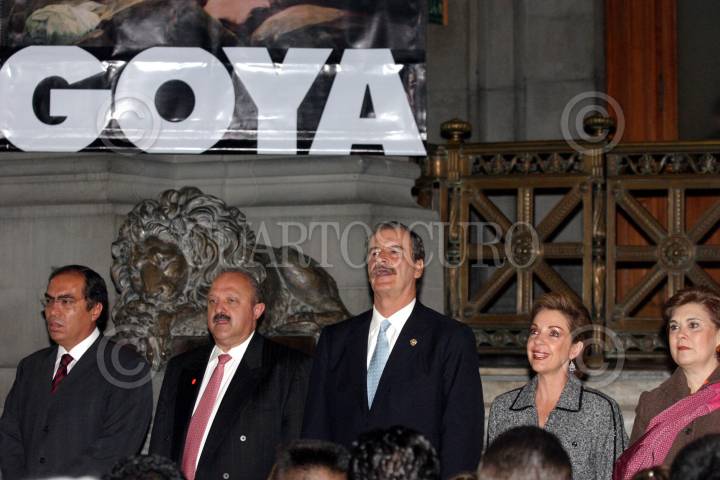 MEXICO, D.F., 21NOVIEMBRE2005.-Saúl Juárez, director general del INBA, Reyes Tamez, Secretario de Educación, Vicente Fox Quesada, Presidente de la República, Marta Sahagún, esposa del mandatario y Sari Bermúdez, titular del CONACULTA, durante la inauguracion de la exposición del pintor español Francisco Goya llamada "Goya", en el Museo Nacional de Arte. FOTO: Moisés Pablo/CUARTOSCURO.COM