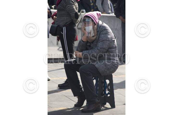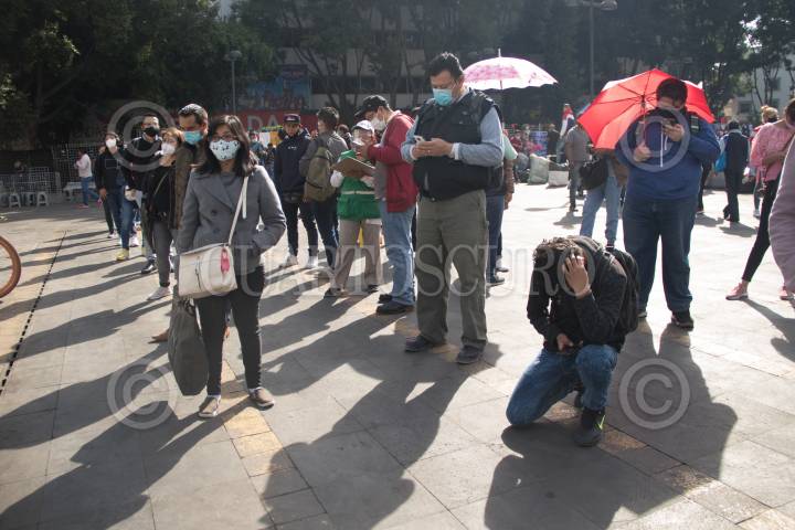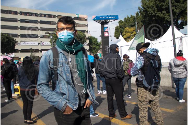 Personas acuden de manera masiva al Macro kiosco Covid-19 en la salida del Metro Pino Suárez.