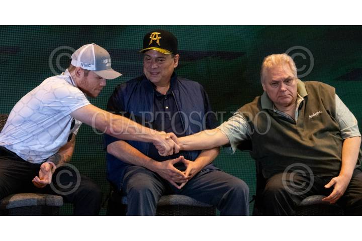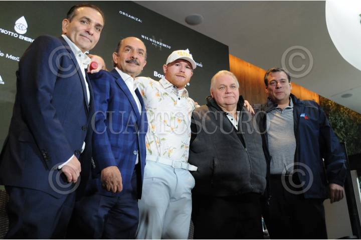 Saúl "Canelo" Álvarez y Mauricio Sulaimán durante la conferencia de prensa de la segunda edición del torneo de Golf "No Golf No Life" en el club Bosque Real de Naucallpan, Estado de México.