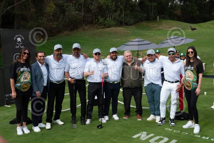 Agustín Piza, León Salame, Saúl "Canelo" Álvarez, Mauricio Sulaimán y Carlos Bremer durante la conferencia de prensa de la segunda edición del torneo de Golf "No Golf No Life" en el club Bosque Real de Huixquilucan, Estado de México.