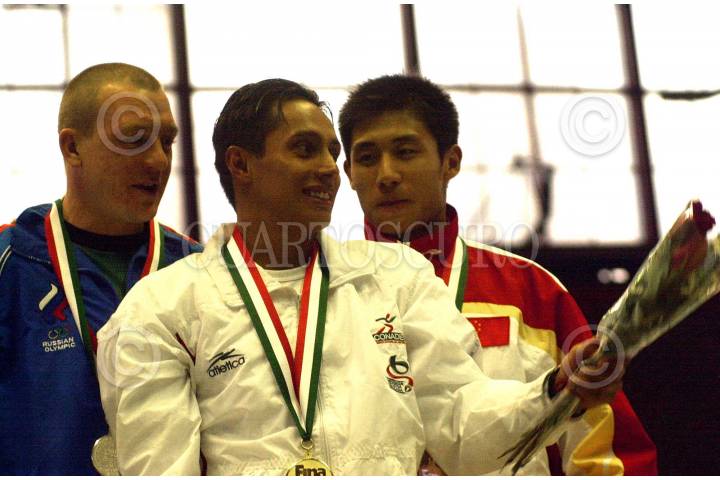 Dimitri Sautin, Fernando Platas y Feng Wang; clavadistas de Rusia, México y China respectivamente; obtuvieron las medallas de plata, oro y bronce en la final de clavados "super final Grand Prix Fina 2002",llevada a a cabo en la Alberca Olímpica "Francisco Marquez". FOTO: Juan Pablo Zamora/CUARTOSCURO.COM