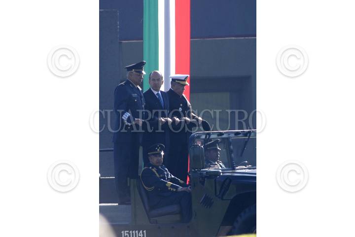 HUEHUETOCA, ESTADO DE MÉXICO 19FEBRERO2007.- El presidente Felipe Calderón Hinojosa, es acompañado del secretario de defensa nacional Guillermo Galvan Galvan del secretario de gobernación Francisco Ramirez Acuña y el secretario de marina Francisco Saynez, al momento de su llegada al desayuno conmemorativo al ¨Día del Ejercito¨ realizado en en el campo militar No. 37 . FOTO: GUILLERMO PEREA/CUARTOSCURO.COM