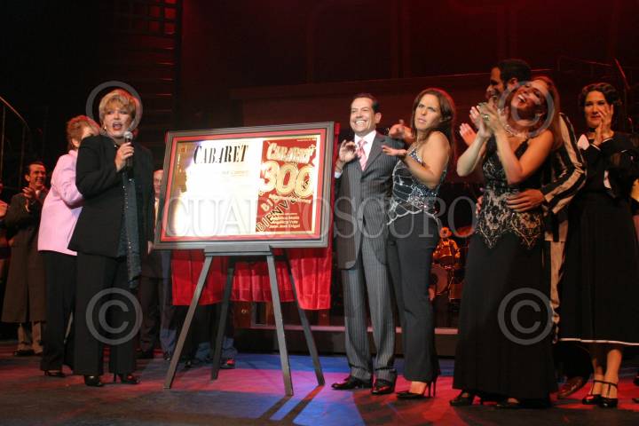 MEXICO; D.F., 30SEPTIEMBRE2005.- Angelica María, Juan José Origel, Tiare Scanda y Angelica Vale, durante la develación de las 300 representaciones de la obra Cabaret, en el teatro Insurgentes. FOTO: Moisés Pablo/CUARTOSCURO.COM