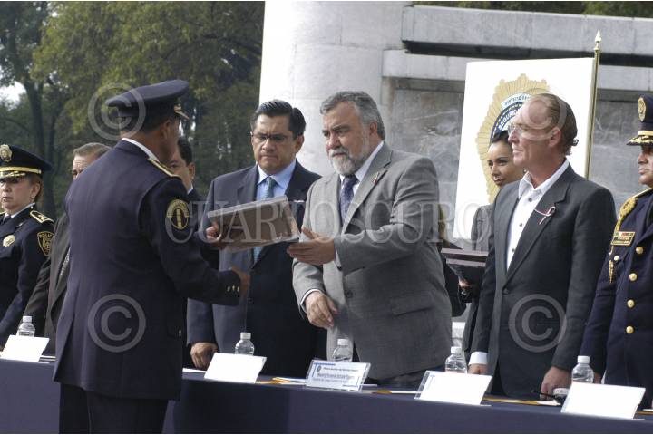MÉXICO, D.F. 14OCTUBRE2006.- Alejandro Encinas, jefe de gobierno, entregó ascensos a policías auxiliares en el monumento a los niños héroes junto con Joel Ortega, secretario de seguridad pública local y Fernando Schutte. FOTO: GUILLERMO PEREA/CUARTOSCURO.COM