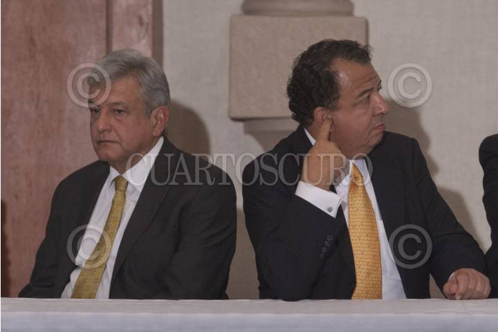 MÉXICO, D.F., 02AGOSTO2012.-Andrés Manuel López Obrador, acompañado de Ricardo Monreal, y los presidentes de los partidos PRD y Movimiento Ciudadano, Jesús Zambrano y Luis Walton, ofrecieron una conferencia de prensa donde dieron a conocer las triangulaciones que presuntamente realizó el PRI a través de la cuentas de Luis Videgaray en ScotiaBank y Bancomer, con las que transferian a otras cuentas de manera inmediata. FOTO: JUAN PABLO ZAMORA /CUARTOSCURO.COM