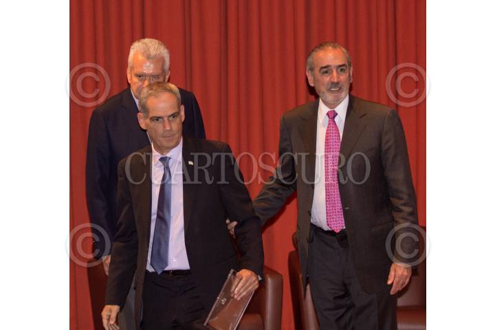 CIUDAD DE MÉXICO, 09MAYO2017.- Enrique Partida; Jonathan Peled, embajador de Israel en México, y Enrique Zorrilla, director general de Scotiabank, durante la presentación del primer congreso de “Seguridad Scotiabank Mexico Cyber Seguridad de Inteligencia 2017”. Peled destacó la gran lucha que se vive dentro de las plataformas digitales para evitar el robo de información a nivel mundial. FOTO: GALO CAÑAS /CUARTOSCURO.COM