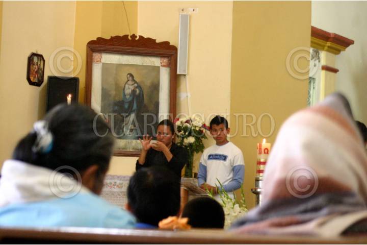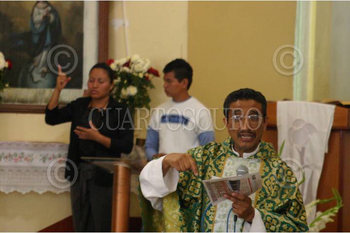 SAN BARTOLO COYOTEPEC, OAXACA, 20JULIO2008.- Las homilias en la iglesia de San Bartolo Coyotepec, cuna del barro negro, cuenta con un interprete de alfabeto para sordomudos, única iglesia en el estado oaxaqueño con este servicio comunitario. FOTO: MAX NÚÑEZ/CUARTOSCURO.COM