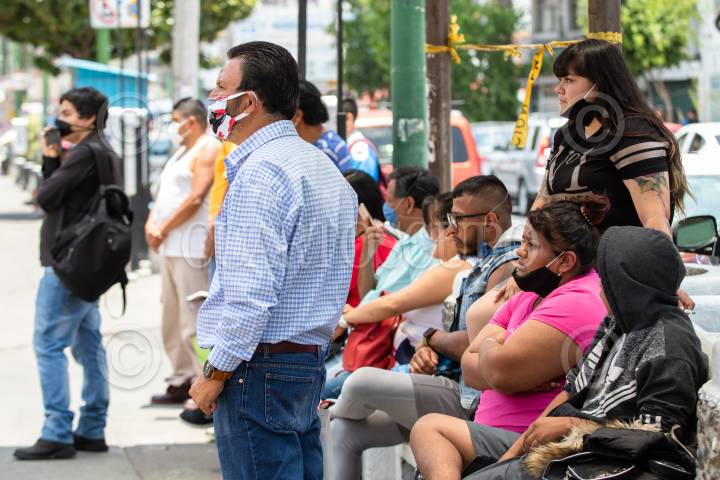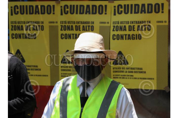 Un checado de taxis, espera la llegada de un operador del transporte público, frente a un mural con pancartas que advierten la zona de alto contagio.