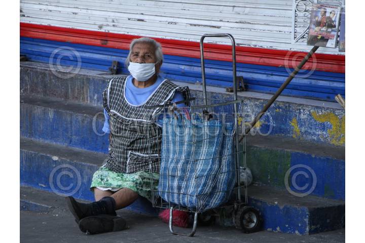 Señora de la tercera edad, toma un descanso después de las compras en el tianguis.