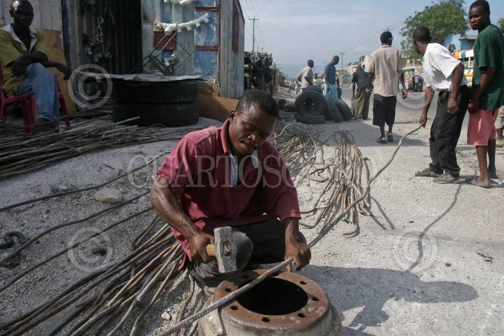 PUERTO PRÍNCIPE, HAITI, 30ENERO2010.- Personas enderezan varillas sacadas de los edificios derrumbados en Puerto Príncipe para que sean reutilizadas en nuevas construcciones. FOTO: ISAAC ESQUIVEL/CUARTOSCURO.COM