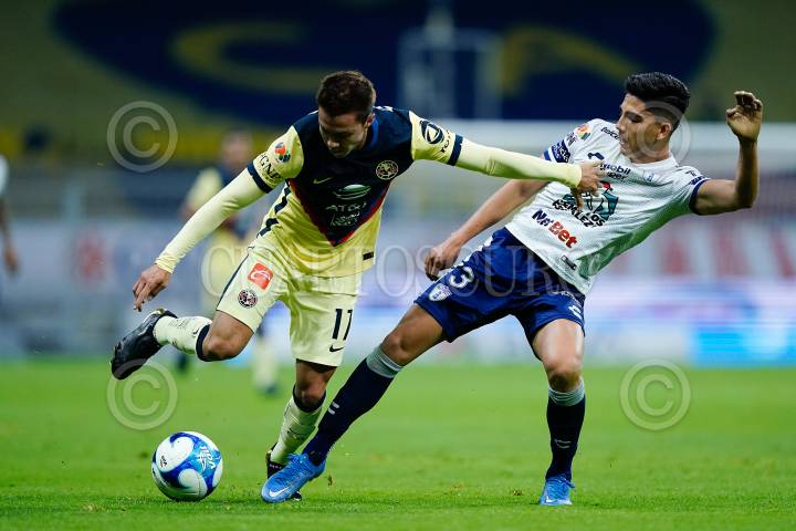 Sebastián Córdova (América) elude a un jugador del Pachuca, durante el encuentro en el Estadio Azteca.