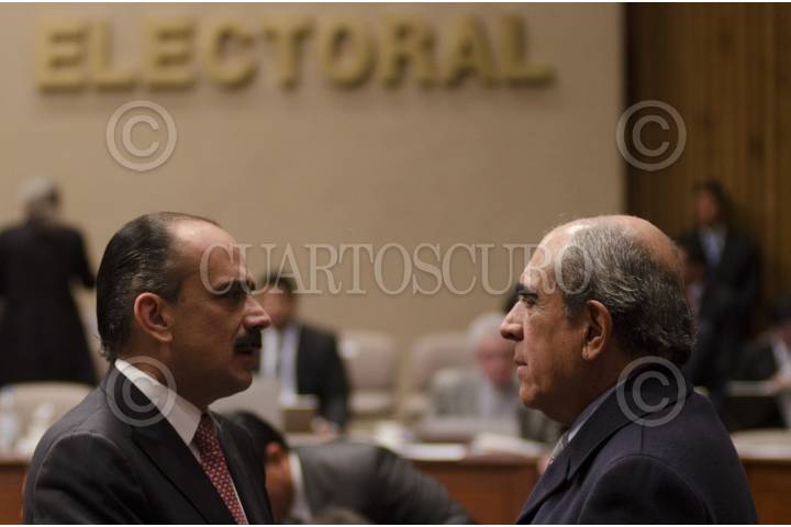 MÉXICO, 08FEBRERO2012.- Los representantes Sebastián Lerdo de Tejada (PRI) y Pablo Gómez (PRD), conversan en la en la sesión extraordinaria del IFE. FOTO: CUARTOSCURO.COM