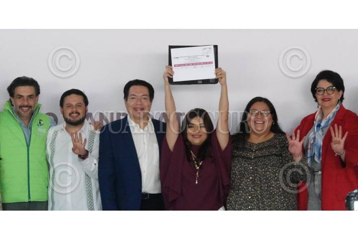 CIUDAD DE MÉXICO, 15FEBRERO2024. Jesús Sesma Ramírez, dirigente del Partido Verde Ecologista de México; Sebastián Ramírez presidente de Morena en la ciudad; Mario Delgado, dirigente Nacional de Morena; Clara Brugada, candidata a la Jefatura por la Ciudad de México; Citlalli Hernández, secretaria general de Morena y Magdalena Núñez, dirigente del Partido del Trabajo, encabezaron el registro de la candidata en las instalaciones del Instituto Electoral de la Ciudad de México. FOTO: GRACIELA LÓPEZ /CUARTOSCURO.COM