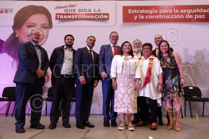 CIUDAD DE MÉXICO, 16ABRIL2024.- Sebastián Ramírez, presidente de Morena en la capital; Omar García Harfuch, candidato a senador; Marcelo Ebrard, candidato a senador; Clara Brugada, candidata a Jefa de Gobierno; Alejandro Encinas, ex subsecretario de Derechos Humanos; Ernestina Godoy, candidata a senadora, y Karen Castrejón, presidenta del Partido Verde, durante la Estrategia de Seguridad en el Ex Convento de San Hipólito. FOTO: GRACIELA LÓPEZ /CUARTOSCURO.COM