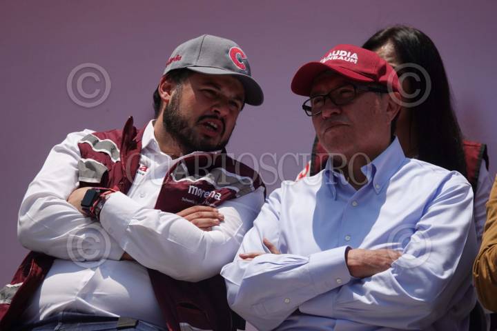 CIUDAD DE MÉXICO,05MMAYO2024.-Sebastián Ramírez, presidente de Morena, y el senador Ricardo Monreal, conversaron durante el mitin electoral en el Centro de Coyoacán. FOTO: GRACIELA LÓPEZ /CUARTOSCURO.COM