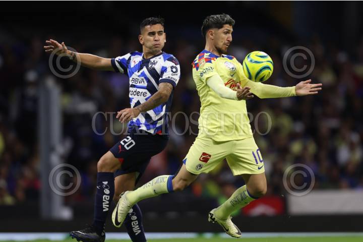 CIUDAD DE MÉXICO, 03FEBRERO2024. Sebastián Vegas de Rayados y Diego Valdés de las Águilas disputan una pelota durante el partido de fútbol América vs Monterrey correspondiente a la jornada 5 del Torneo Clausura 2024 de Liga BBVA MX, en el Estadio Azteca. FOTO: EDGAR NEGRETE LIRA/CUARTOSCURO.COM