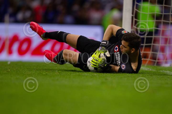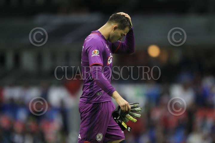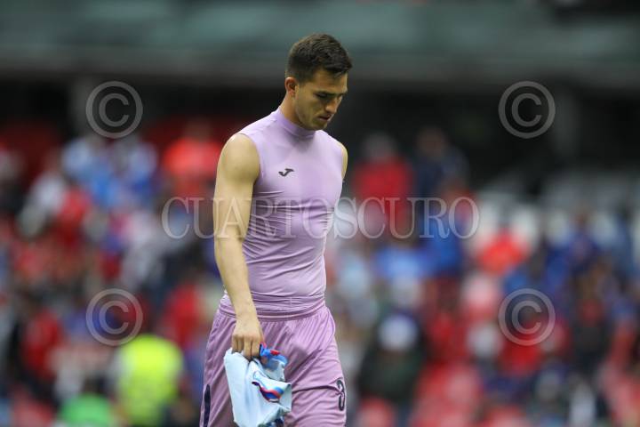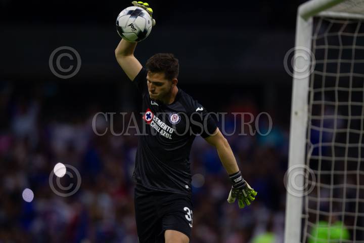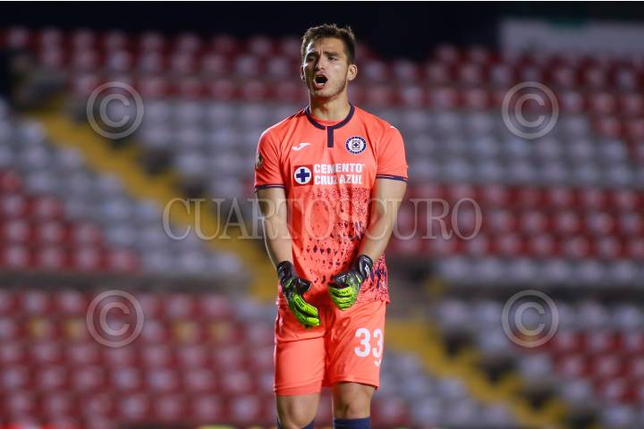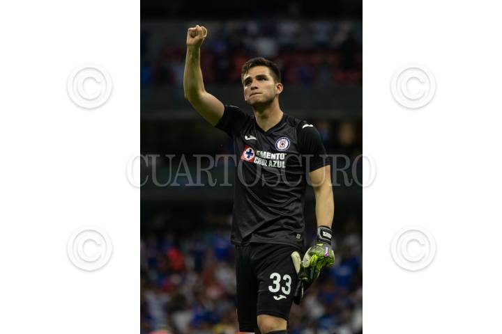 El portero de Cruz Azul Sebástian Jurado durante el partido de fútbol correspondiente al repechaje del torneo Clausura 2022 “Grita por la Paz” de la Liga MX entre Cruz Azul vs Necaxa en el Estadio Azteca.