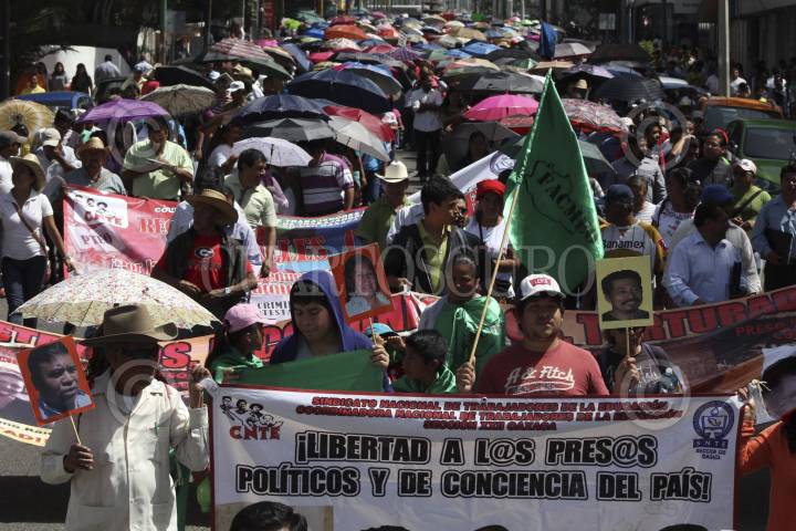 OAXACA, OAXACA, 07AGOSTO2013.- Profesores de la Sección 22 del SNTE y activistas adheridos a la FACMEO marcharon este miércoles en la ciudad de Oaxaca para exigir la liberación de 2 profesores y 3 activistas detenidos acusados del secuestro de 2 menores. Los mentores sostienen de que los presuntos culpables son inocentes y que son presos políticos. FOTO: ARTURO PÉREZ ALFONSO /CUARTOSCURO.COM