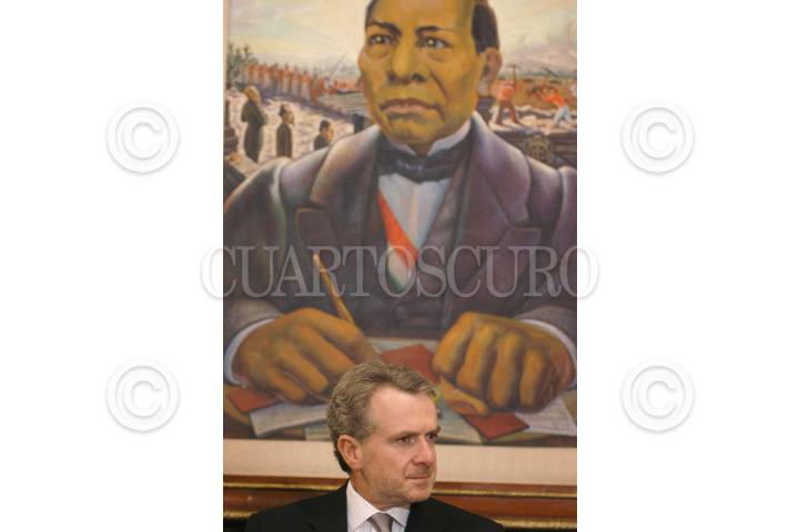 MEXICO D.F. 28ABRIL2005.- El secretario de Gobernaciòn Santiago Creel, entregó reconocimientos a dos niños que ganaron un concurso internacional de cartel. FOTO: Germàn Romero/CUARTOSCURO.COM