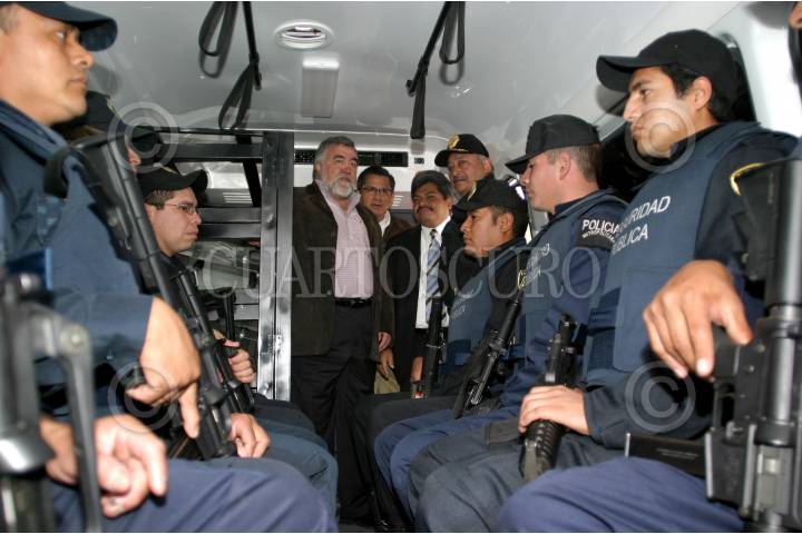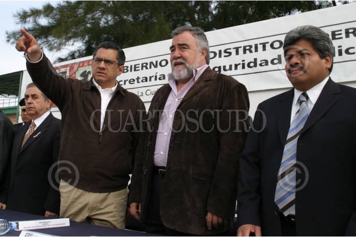 MÉXICO D.F. 18NOVIEMBRE2006.- El jefe de gobierno capitalino Alejandro Encinas, acompañado del secreatarío de seguridad pública Joel Ortega y Francisco Chiril Figueroa delegado de Gustavo A. Madero, durante la ceremonia de abanderamiento del 24a. unidad de protección ciudadana en el Deportivo los Galena. FOTO: GUILLERMO PEREA/CUARTOSCURO.COM